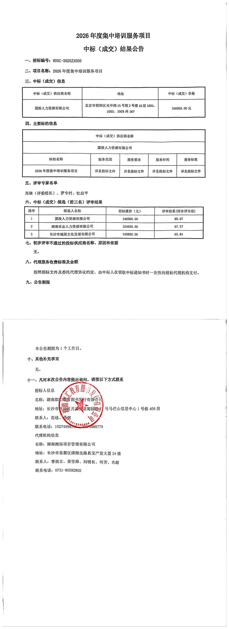2026年度集中培训服务项目中标(成交)结果公告